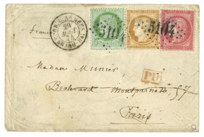 1874 Shanghai (29 Aug) to France, f.w. Ceres 5c + 15c + 80c, tied by 5104 diamond of dots, alongside with "CORR D ARMEES / SHANGHAI" cds and framed PD cachet. Arrived France (Oct). Exceptional early example.