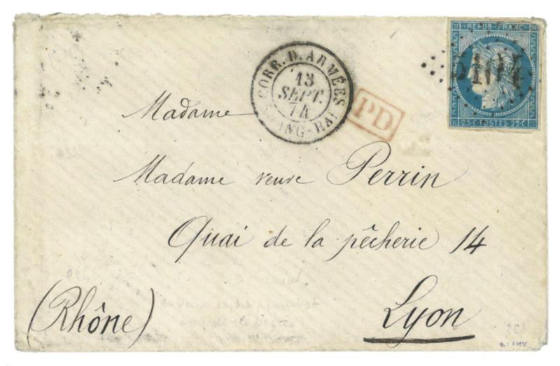 1874 Shanghai (13 Sep) to France, f.w. imperf Ceres 25c, tied by 5104 diamond of dots, alongside with "CORR D ARMEES / SHANGHAI' cds and framed PD cachet. On reverse with French marine anchor circular seal. Arrived France (30 Oct). Exceptional scarce franking.