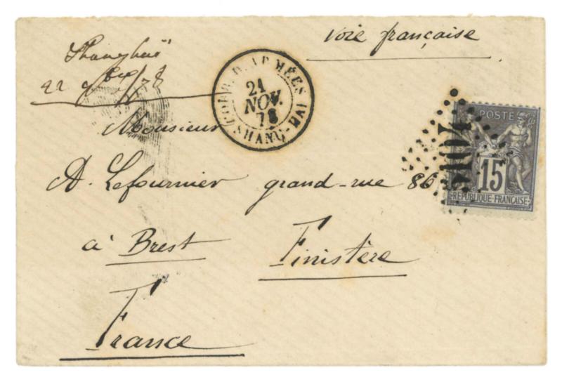 1878 Shanghai (21 Nov) to France, f.w. Peace and Commerce issue 15c, tied by 5104 diamond of dots, alongside with "CORR D ARMEES / SHANGHAI" cds. Very rare franking of 15c.
