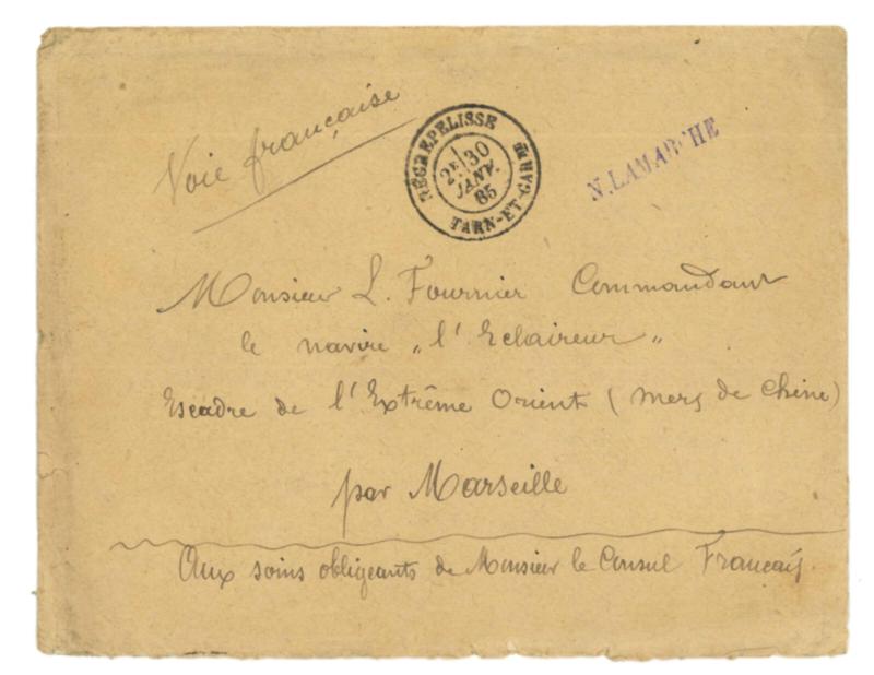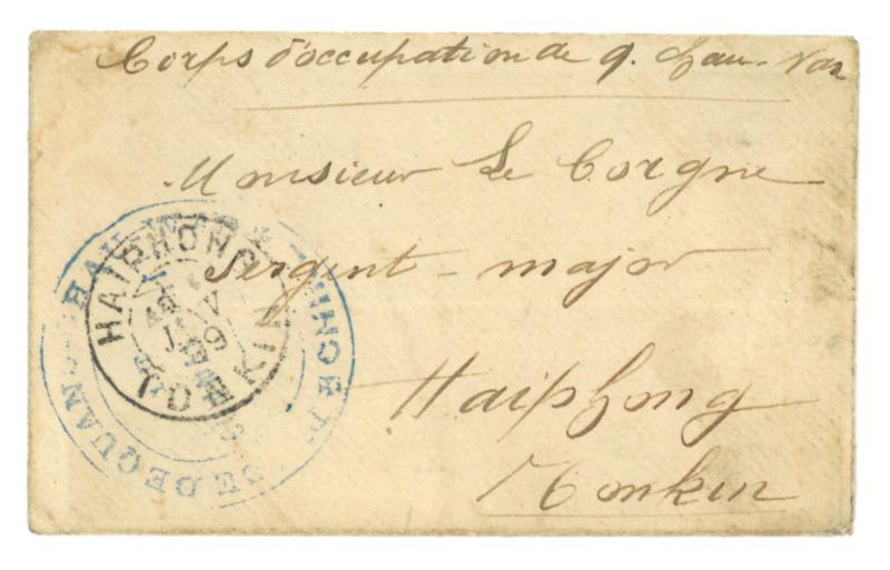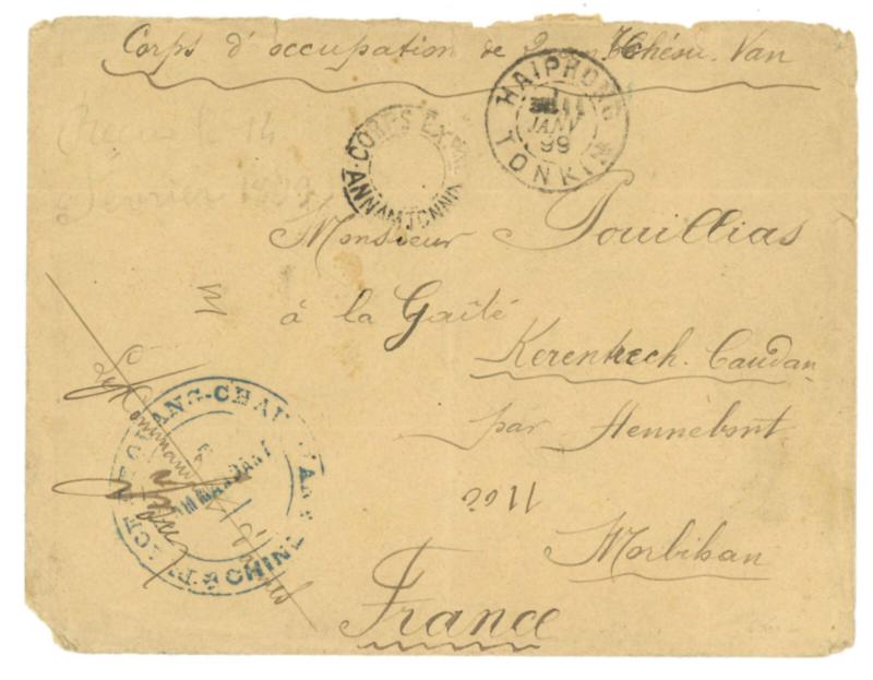 1899 (11 Jan) Corps d'Occupation de Quan Tcheou Van cover to France, frankless, applied with "Place de Quang Chau Wan / Le Commandant / Chine" circular seal, scarce "CORPS EXPRE / ANNAM TONNIN" h.s. (with wrong spelling of Tonnin) and Haiphong cds, alongside with officer countersign. Arrived France (12 Feb). A very early and scarce example dated 1899.