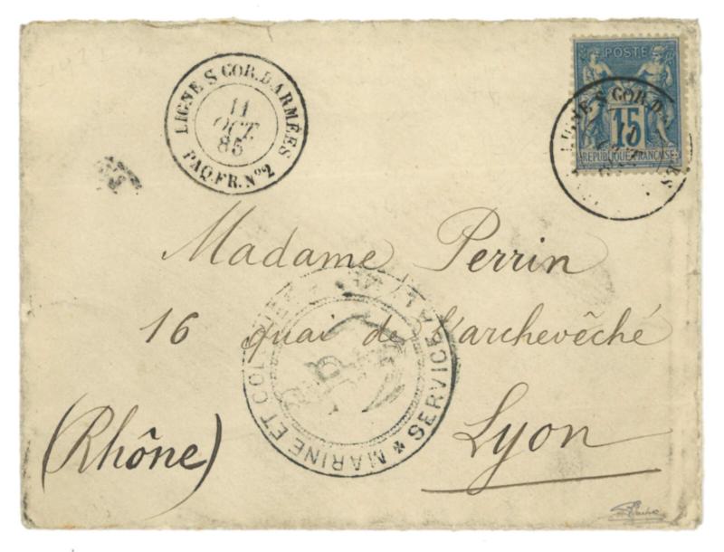 1885 (11 Oct) French military cover from China, f.w. Peace and Commerce issue 15c, tied by "LIGNE S COR D ARMEES / PAQ FR No.2" cds., alongside with French marine circular seal. Arrived Lyon (21 Nov). Nice paquebot example of 15c franking.