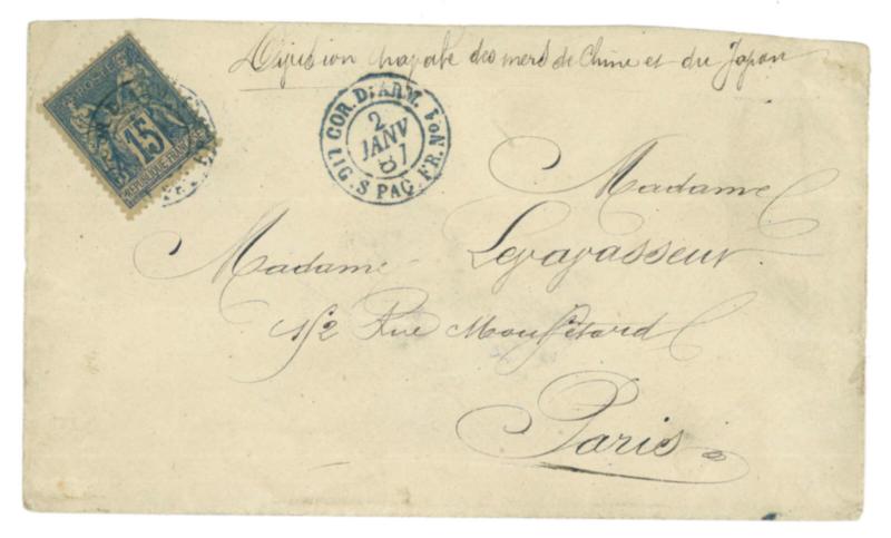 1887 (2 Jan) Division Navale des Nords du Chine et du Japan cover to France, f.w. Peace and Commerce issue 15c, tied by "COR D' ARm / LIG S PAQ FR No. 1" cds. On reverse showing French marine anchor circular seal. With Pothion signature on reverse. Very rare naval example.