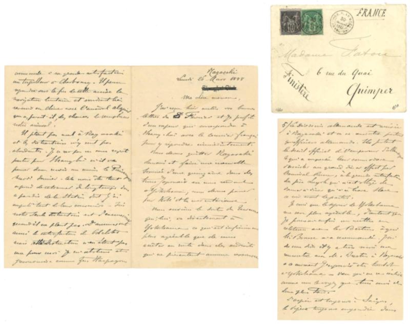 1888 Nagasaki (26 Mar) to France, f.w. Peace and Commerce issue 5c + 10c, tied by "CORR D ARMEE / SHANGHAI" cds. Transit Paris (6 May). Arrived Finistere (7 May). With original letter showing Nagasaki origin. Scarce example from Japan.