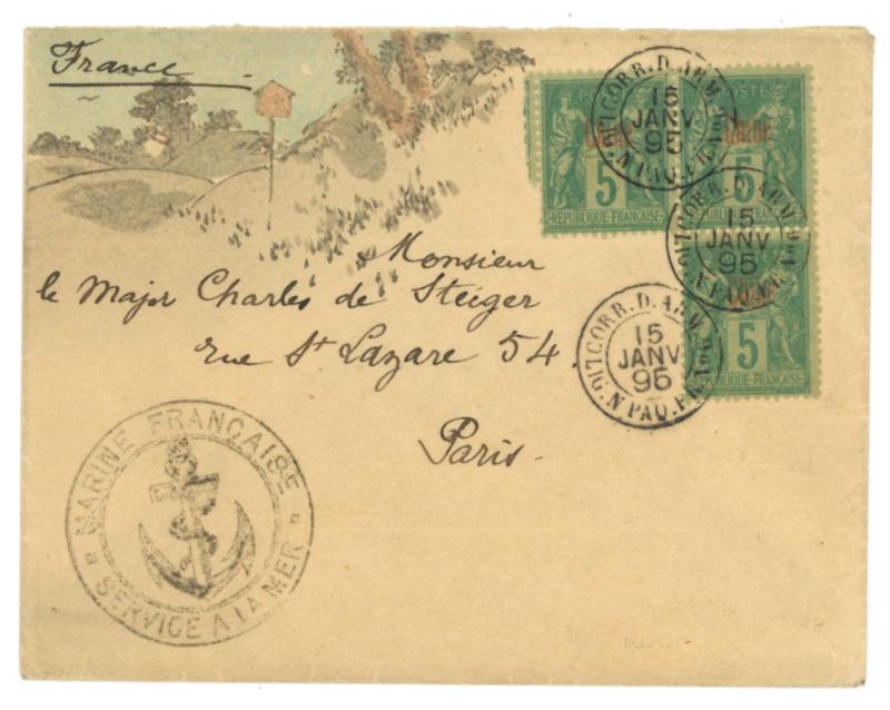 1895 (15 Jan) French military cover from China, f.w. Peace and Commerce ovpt. Chine 5c in block of 3, tied by "CORR D ARM / LIG N PAQ FR No.6" cds., alongside with French marine circular seal. Arrived Paris (22 Feb).