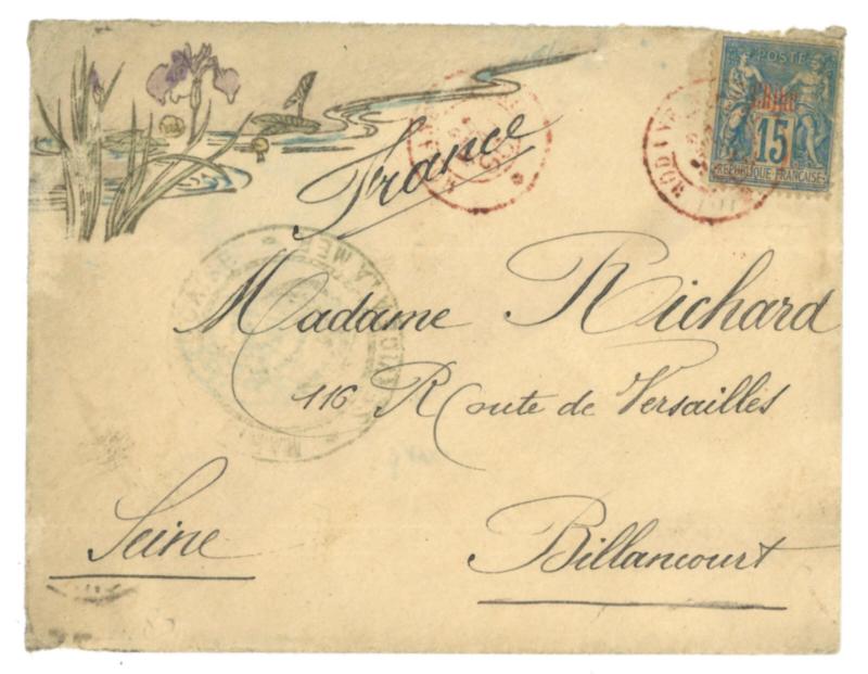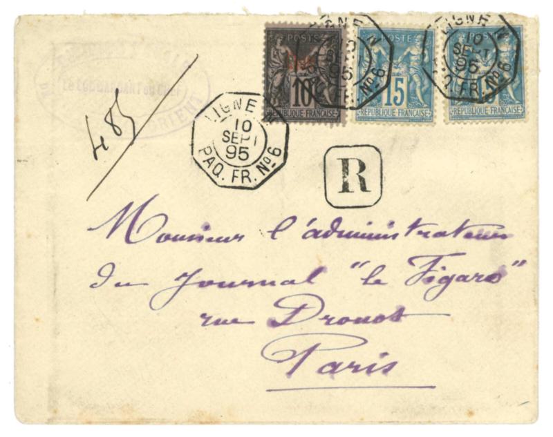 1895 (10 Sep) Divison Navale de L'Extreme-Orient cover to Paris, f.w. Peace and Commerce issue ovpt. Chine 10c + unovpt 2x 15c, tied by Ligne N Paq Fr. No. 6 octangonal d.s. , alongside with "Le Commandant en Chef" oval seal and R mark. Arrived Paris (17 Oct). Rare naval example, not to mention the mixed franking.