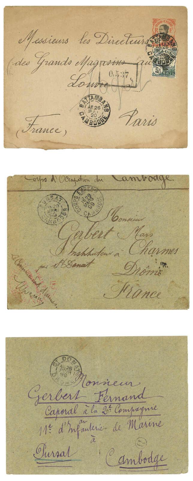 1899 (28 Mar) Corps d'Occupation du Cambodge to France, applied with scarce "Poste de Pueast / Le Commandant d'armes / Cambodge" and "Corps Expedire / Cambodge" cds. Transit Saigon (2 Apr). Example of Corps d'Occupation du Cambodge is rather rare. Cover top trimmed.