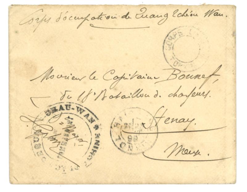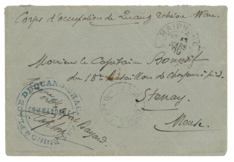 1899 (13 Mar) Corps d'Occupation Quang Tcheou Wan cover to France, frankless, applied with "PLACE DE QUANG CHAU WAN / LE COMMANDANT / CHINE" seal in violet, "CORPS EXPEDITRE / TONKIN" circular h.s. and Haiphong cds. Nice early example. 2019 (Jun) Interasia Auctions, lot 2176.