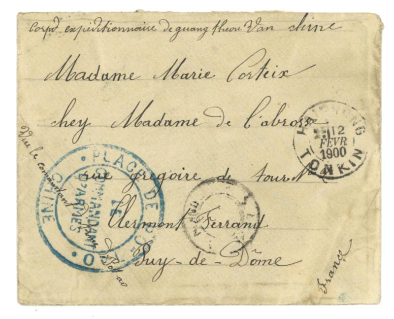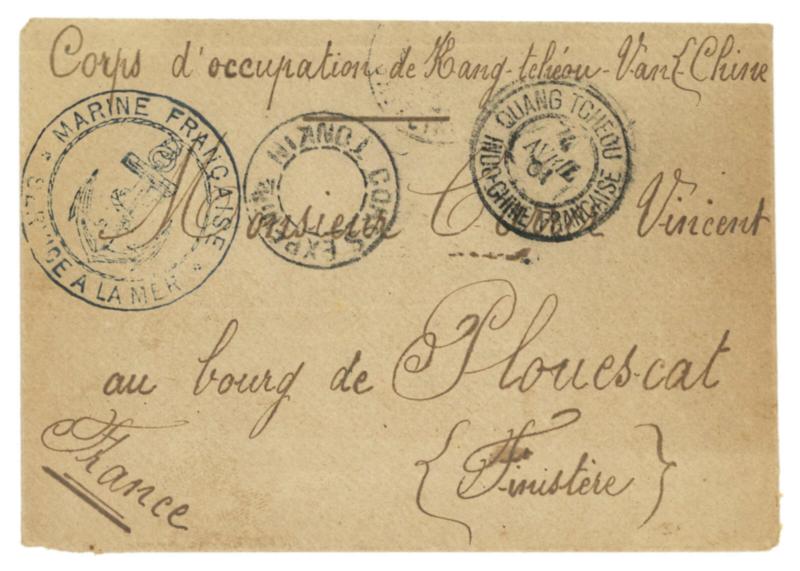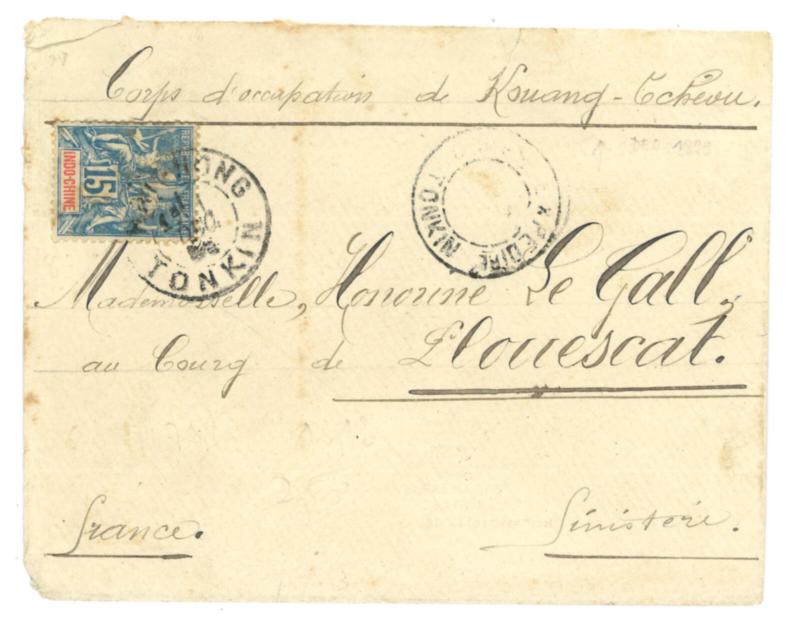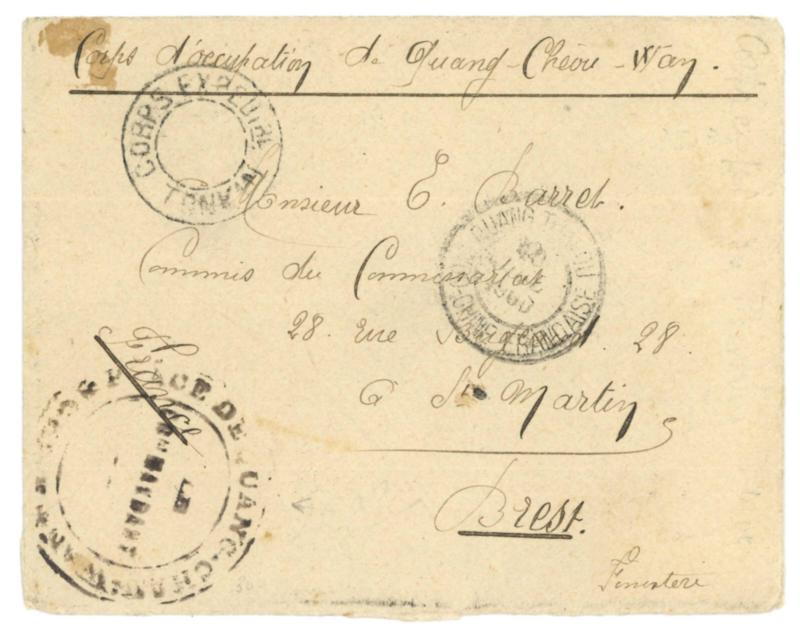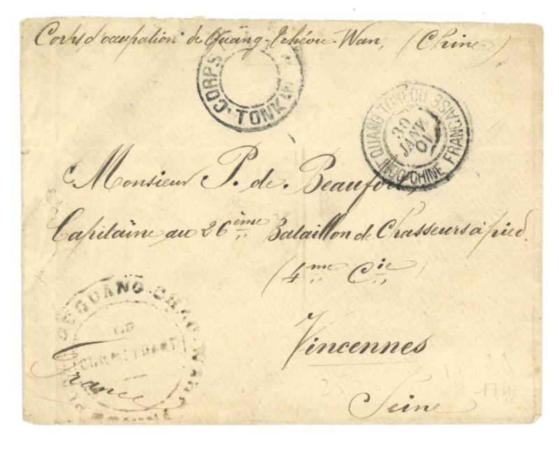 1901 (30 Jan) Corps d'Occupation de Quang-Tcheou-Wan cover to France, applied with "PLACE DE QUANG CHAU WAN / LE COMMANDANT / CHINE" circular d.s., Quang Tcheou type 1 cds and "CORPS EXPEDIRE / TONKIN" circular h.s. Arrived France (13 Mar).