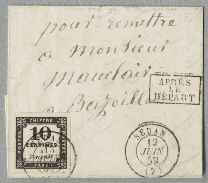 1859-70, 10 c, black, postage due stamp, on cover from SEDAN to BAZEILLES, neatly strike SEDAN 12 JUN 59, aside boxed APRES LE DEPART, very fresh and desirable, magnificent margins, XF-SUP! Schätzpreis 300€. (Image)