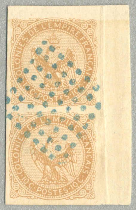 1859-61, 10c, bistre, imperf vertical pair, top right corner margin piece, neatly blue strike, very fresh and desirable, magnificent margins, fold outside the stamps, XF-SUP! Schätzpreis 200€. (Image)
