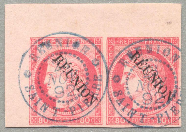1892, 80c, carmine on pinkish, top left corner margin piece, 6x9mm, imperf pair, neatly blue strikes of REUNION SAINT PIERRE, very fresh and desirable, magnificent margins, small pencil cert. Ferchenbauer, XF-SUP! Schätzpreis 300€. (Image)