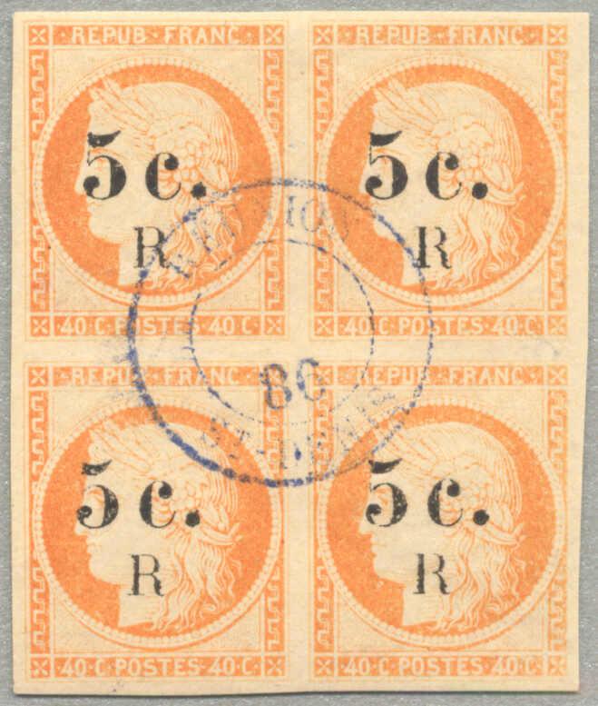 1886, 5c on 40c, orange, imperf block of (4), neatly blue-violet strike of REUNION ST. DENIS, very fresh and desirable, magnificent margins, small pencil cert. Ferchenbauer, XF-SUP! Schätzpreis 1.200€. (Image)