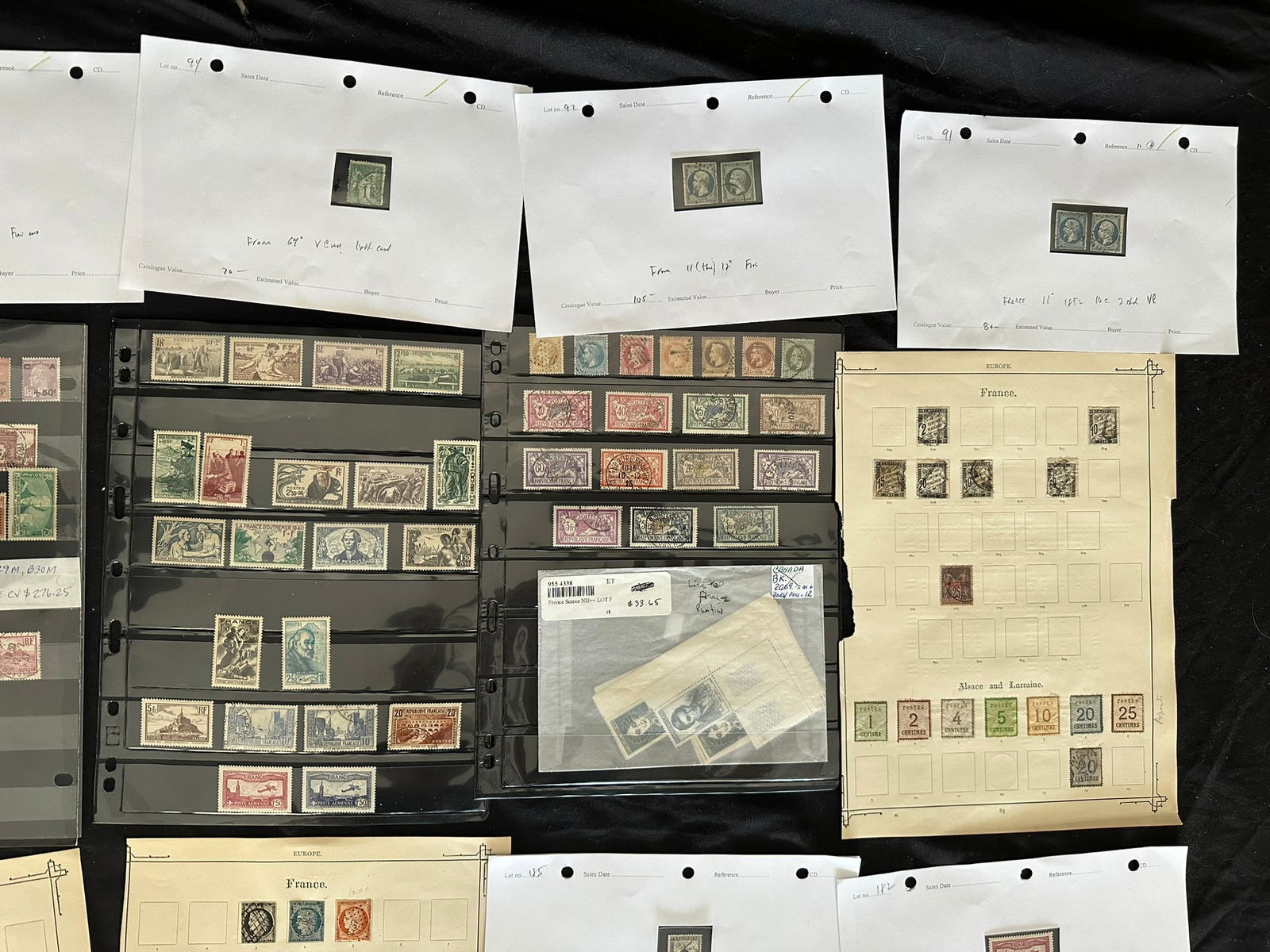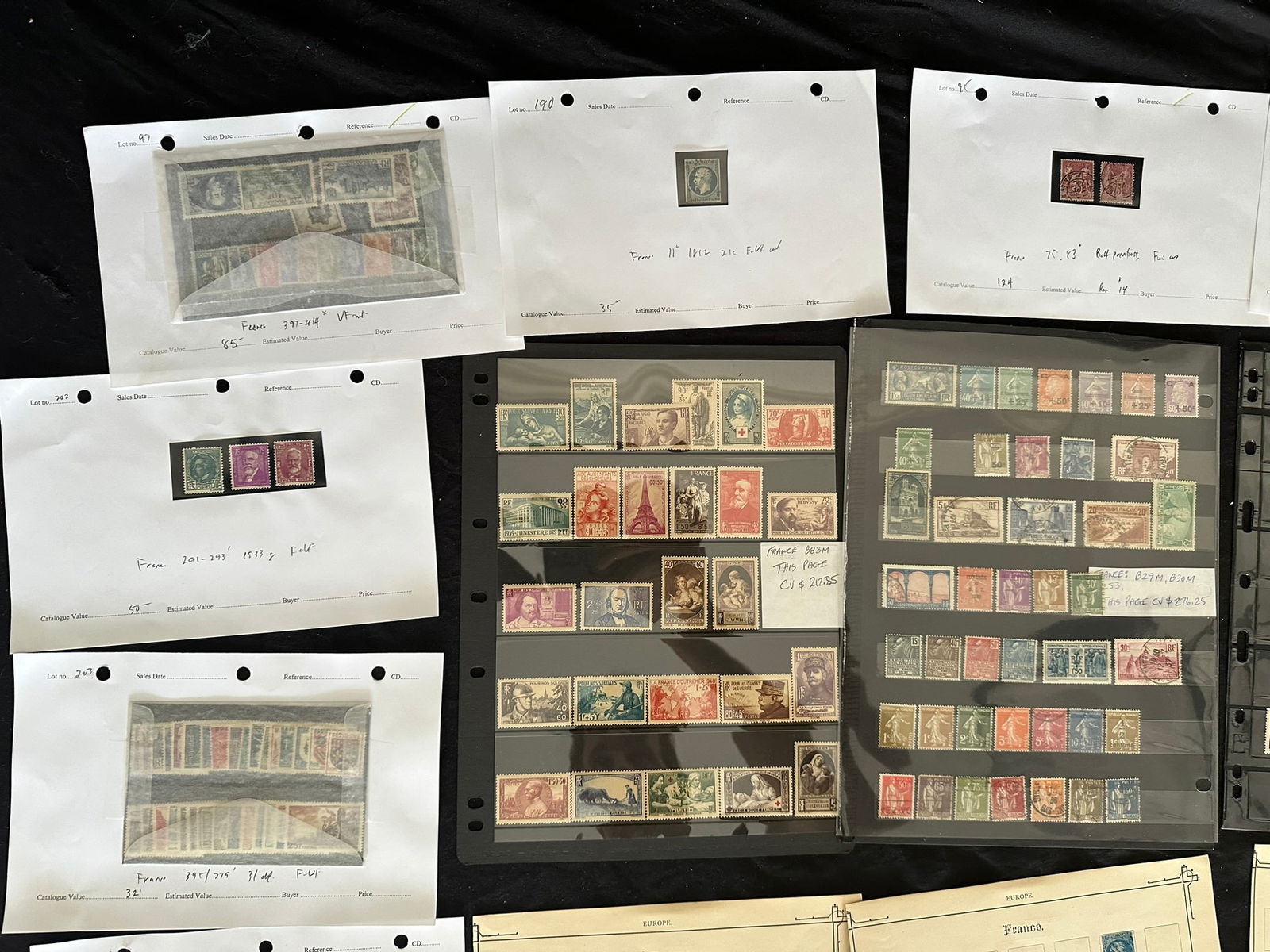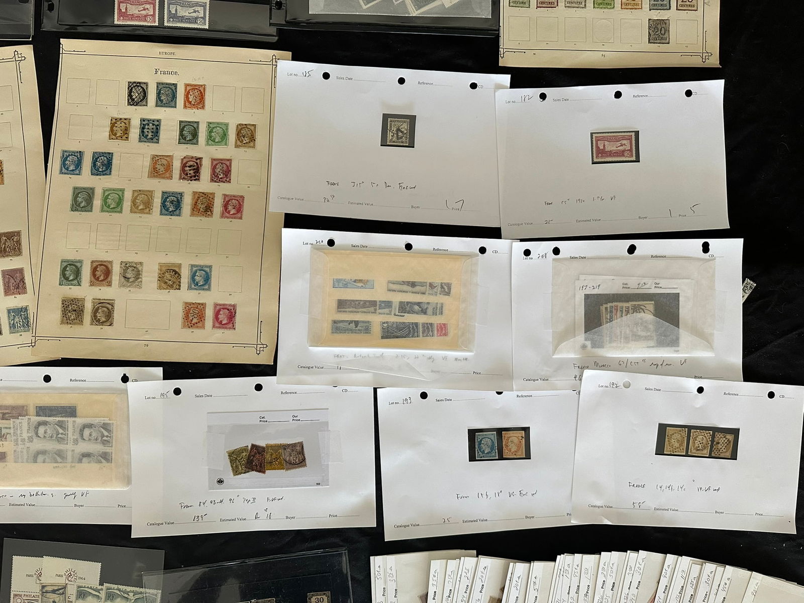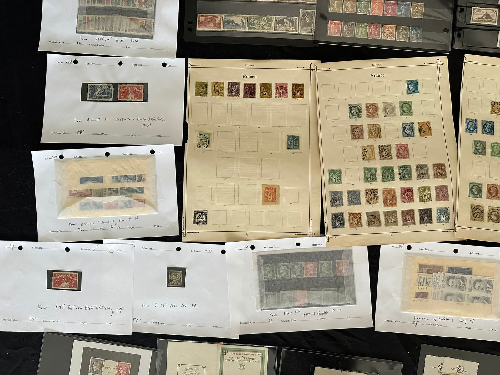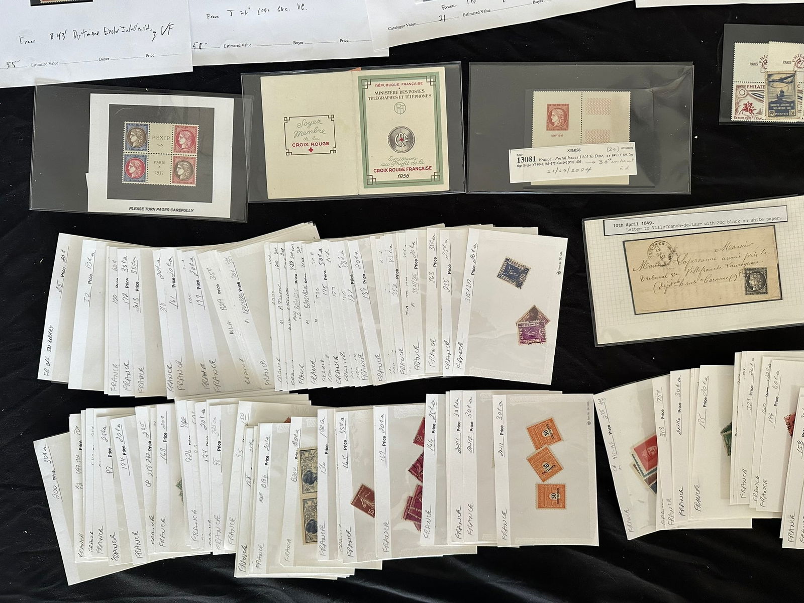 A larger mint and mostly used France accumulation with plenty of better and earlier material throughout. Includes #15/#502 with BOB in identified and priced 103's (some noticeable duplication in places), noticeably better identified and priced items on dealer cards including used #10, #11 (3), #75, #83, #84, #93-#94, #96, #J15, #J18, #J22 plus more, #3/#703 neatly hinged on album pages, better items mostly mint on stock sheets, plus a quality entire dated April 10th, 1849 with a #3 20c black on white paper. Early material generally at least fine, at least f-vf onwards. Very large cat val overall.(Image 1)(Image 2)(Image 3)(Image 4)(Image 5)(Image 6)(Image 7)