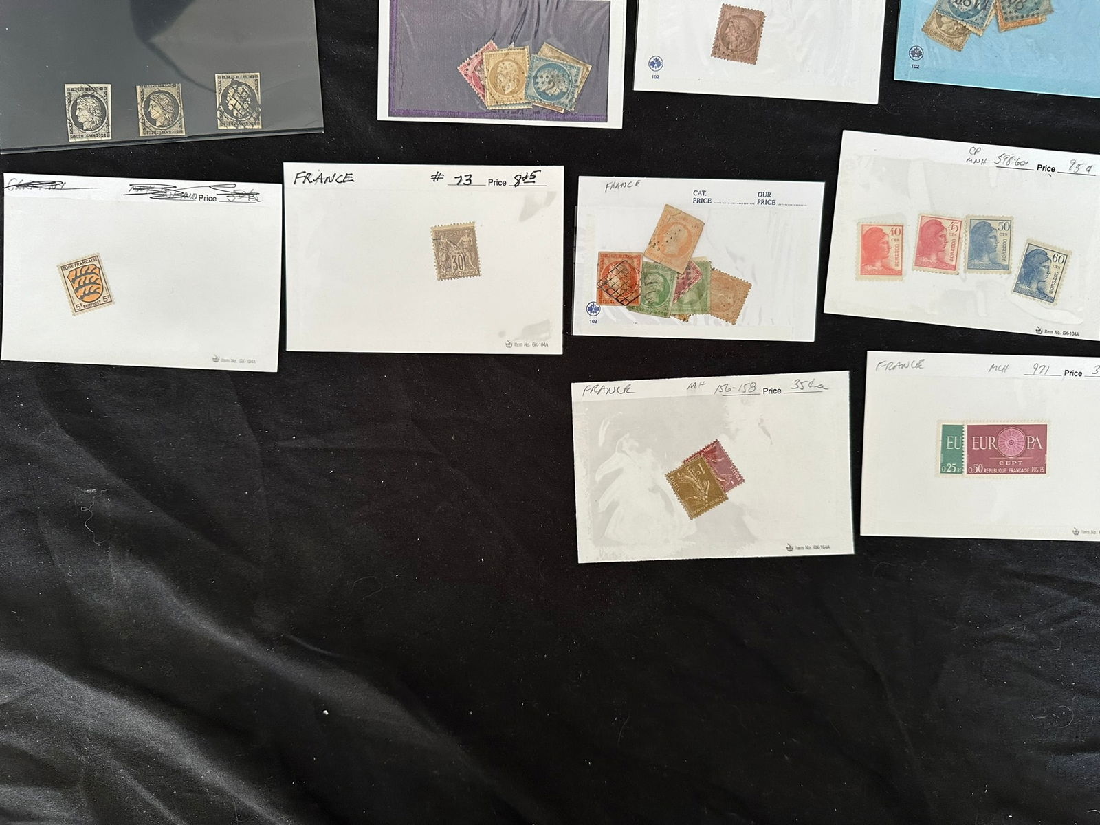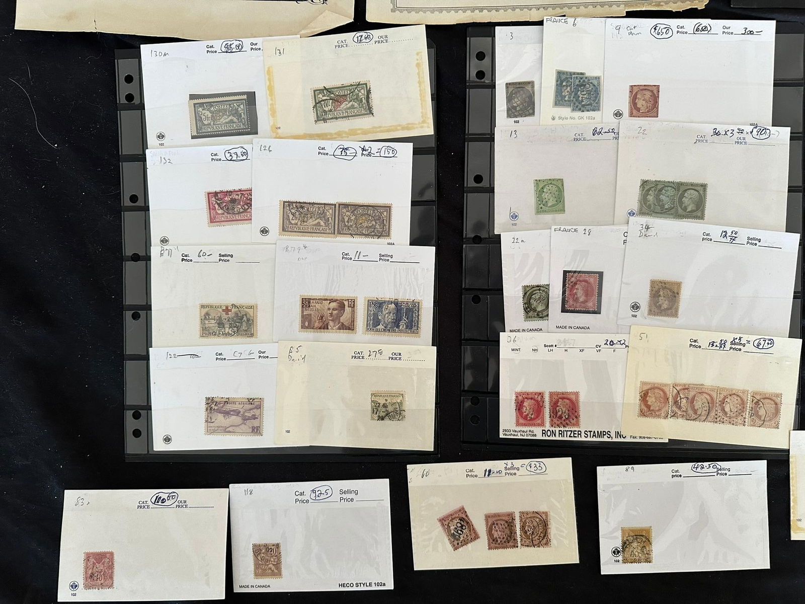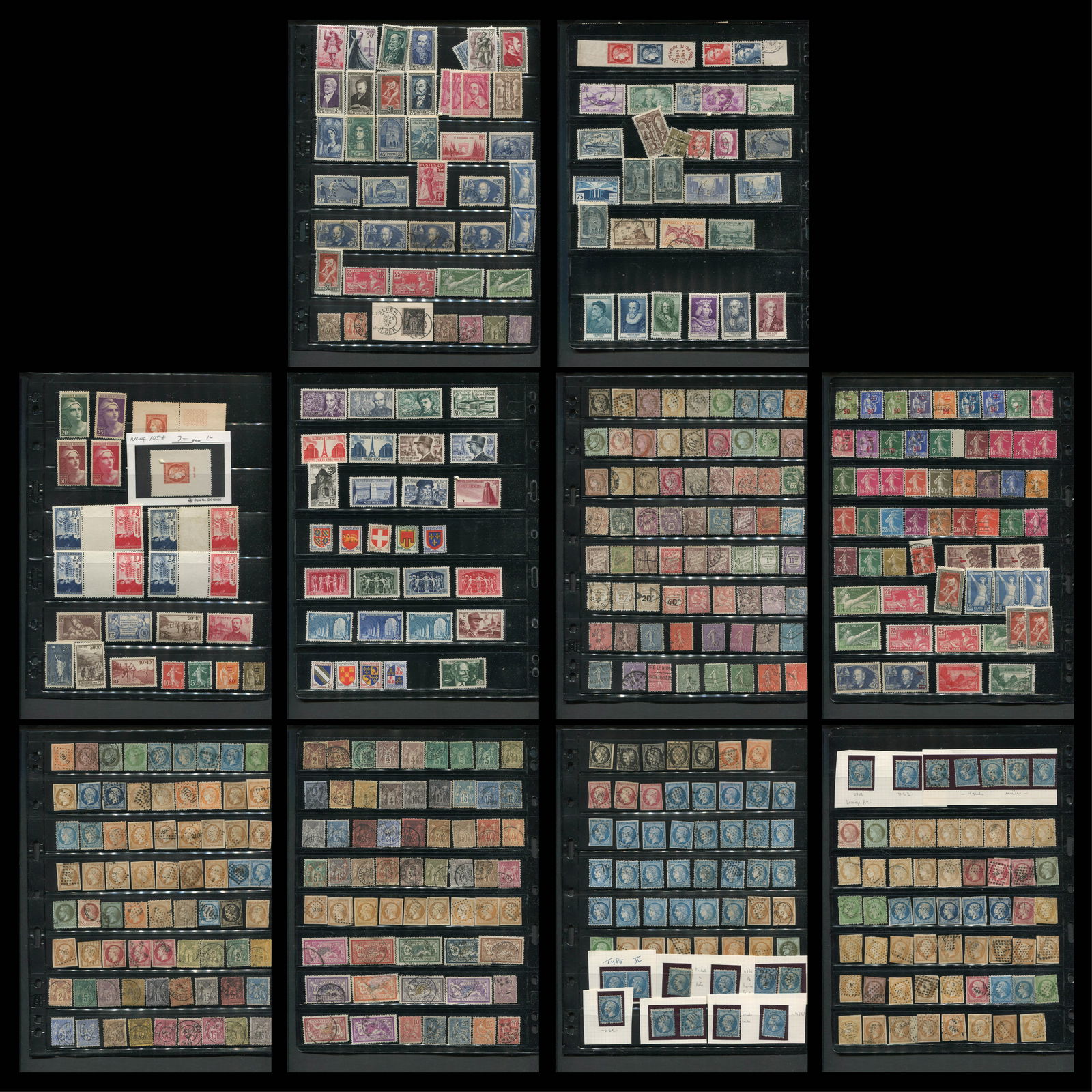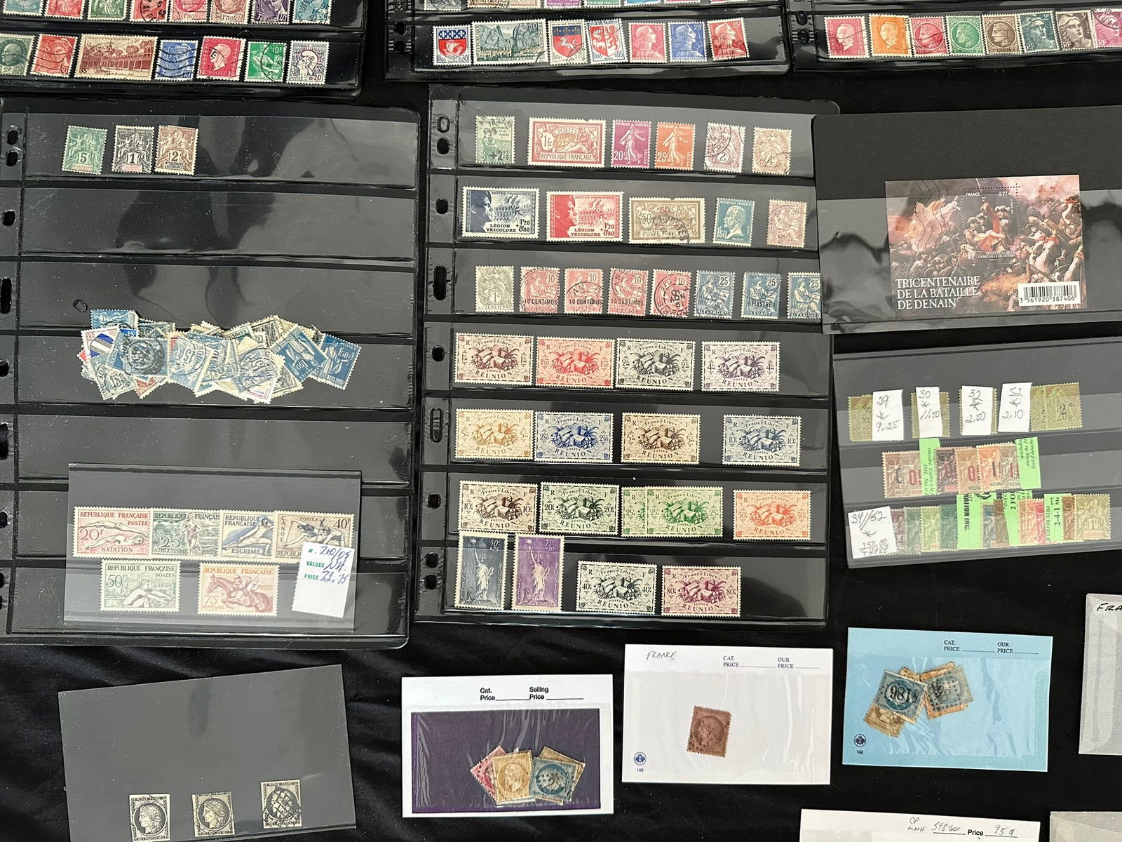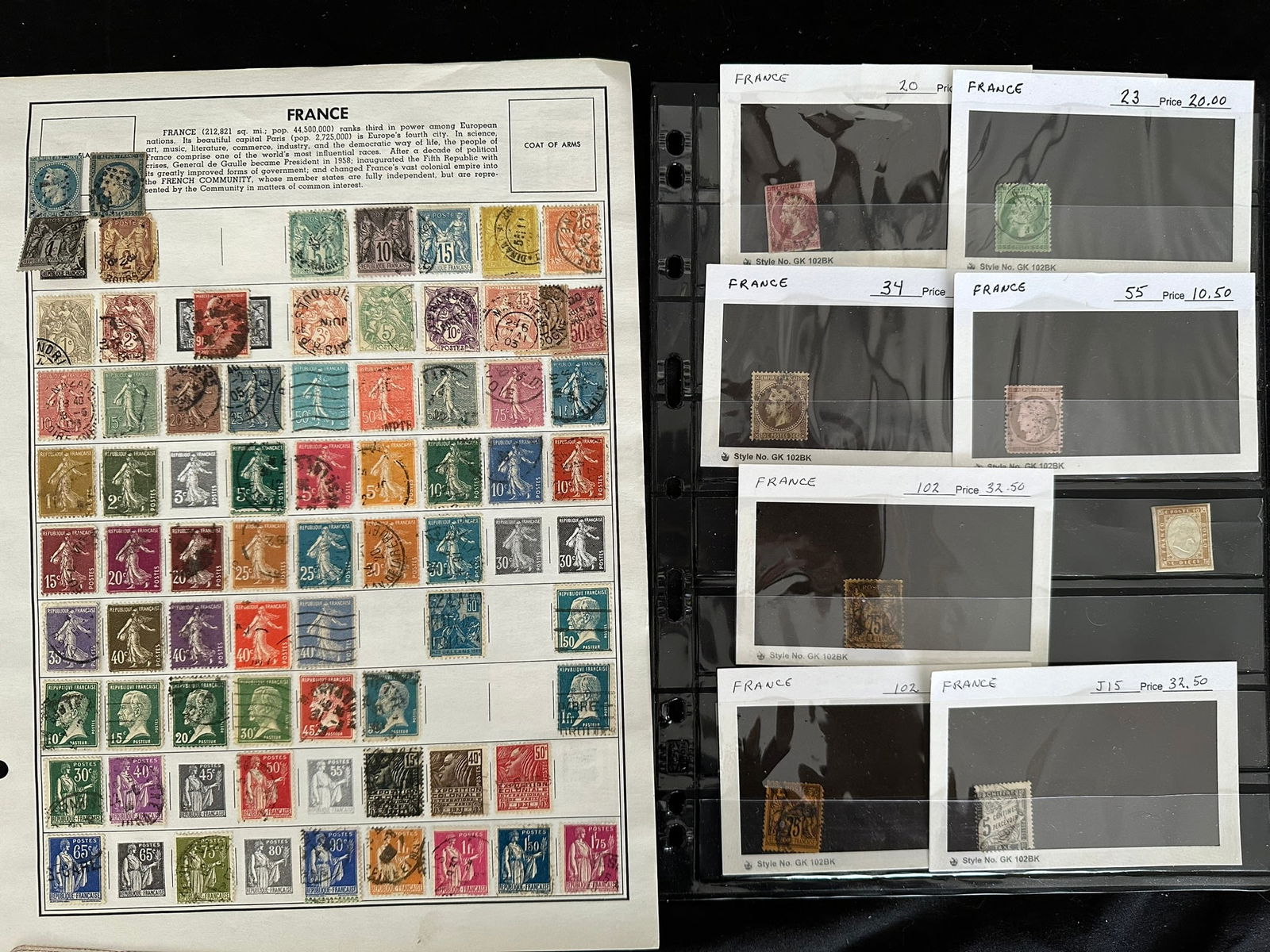 A larger mint and mostly used France accumulation with plenty of better and earlier material throughout. Includes #15/#502 with BOB in identified and priced 103's (some noticeable duplication in places), noticeably better identified and priced items on dealer cards including used #10, #11 (3), #75, #83, #84, #93-#94, #96, #J15, #J18, #J22 plus more, #3/#703 neatly hinged on album pages, better items mostly mint on stock sheets, plus a quality entire dated April 10th, 1849 with a #3 20c black on white paper. Early material generally at least fine, at least f-vf onwards. Very large cat val overall.(Image 1)(Image 2)(Image 3)(Image 4)(Image 5)(Image 6)(Image 7)