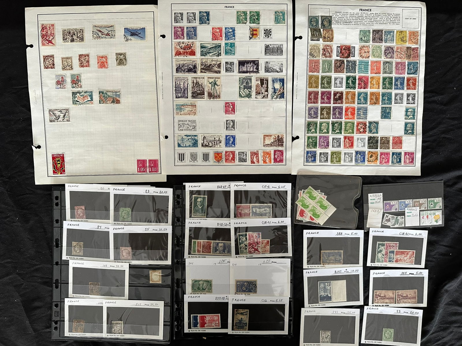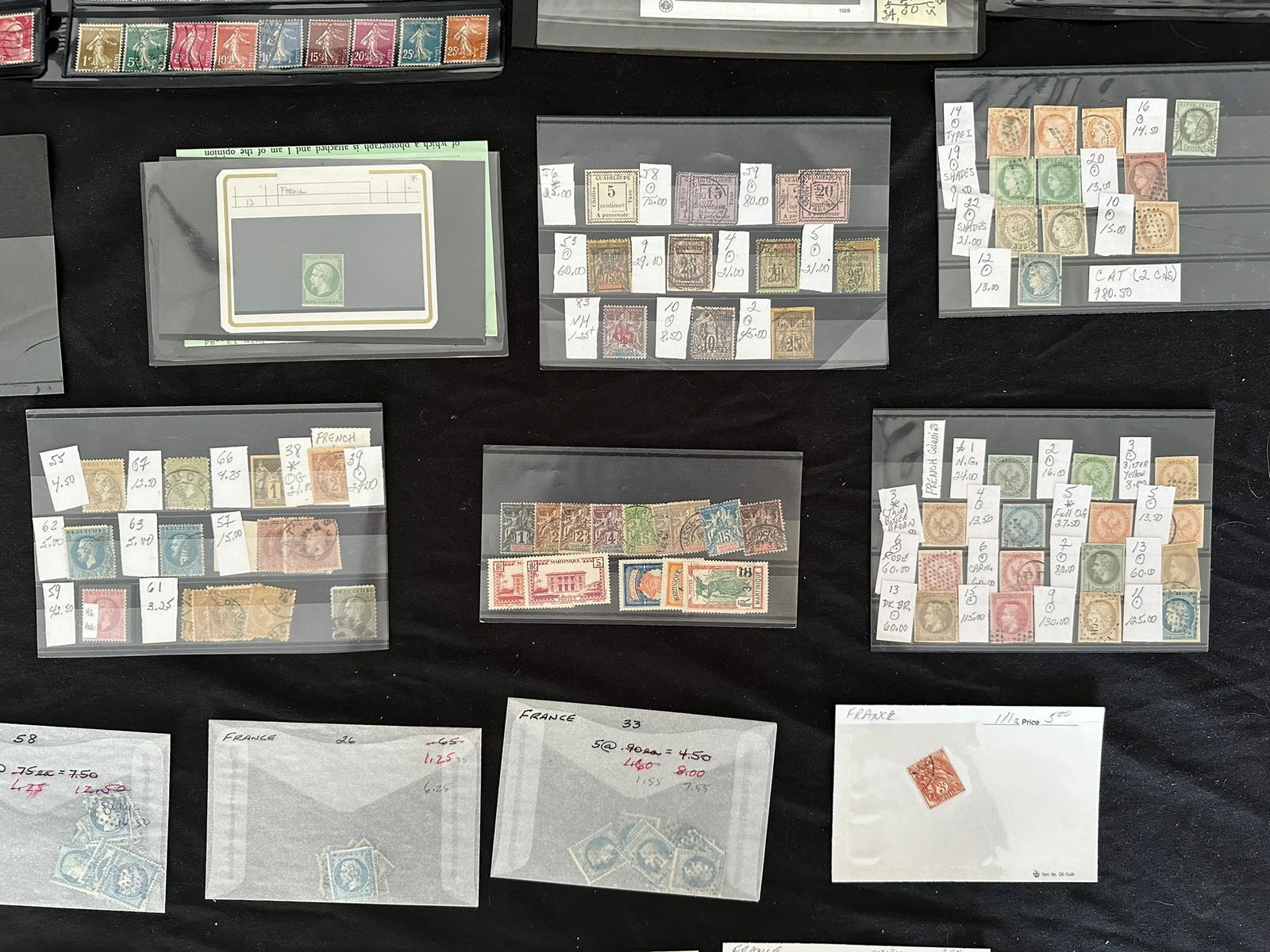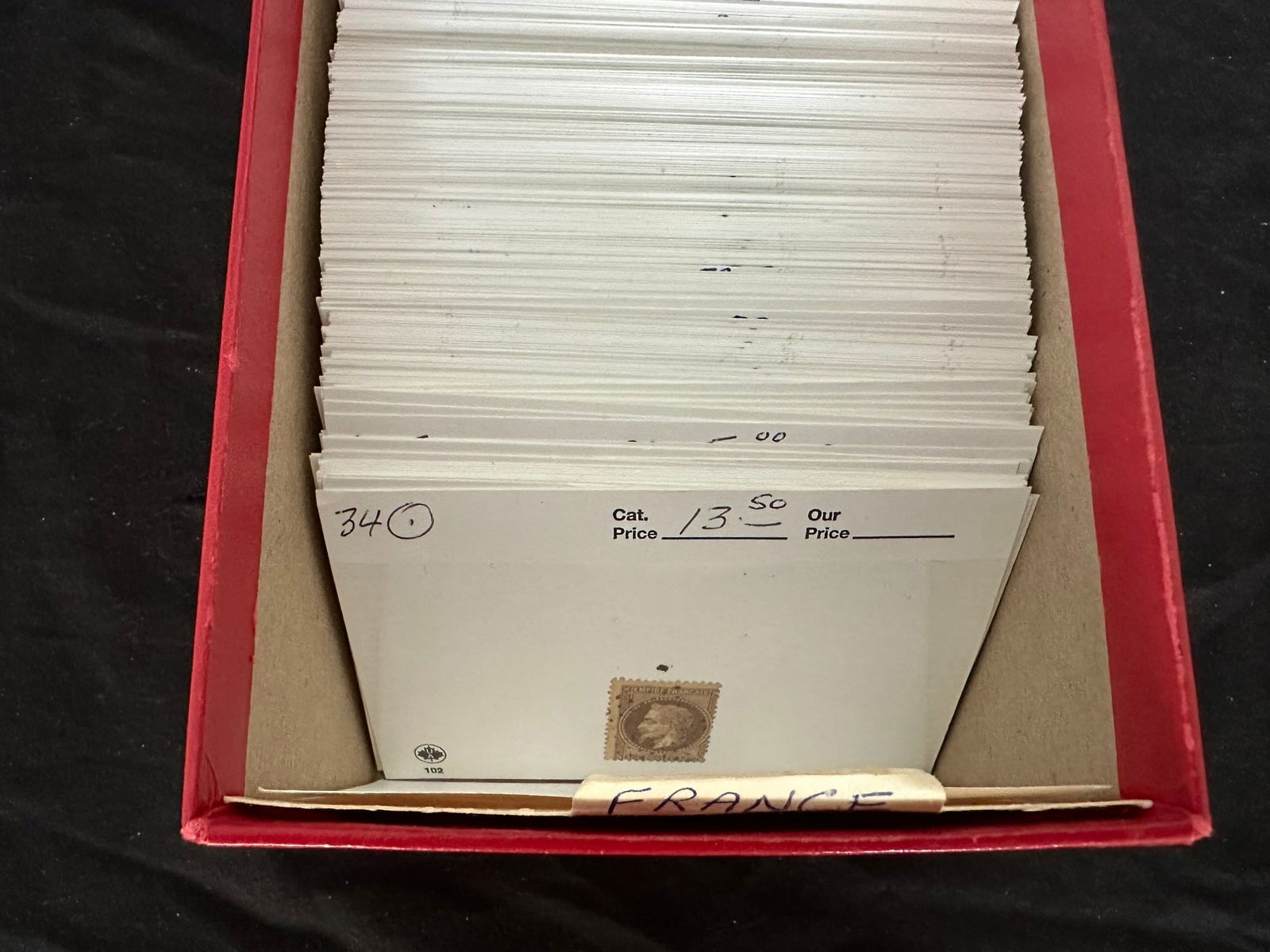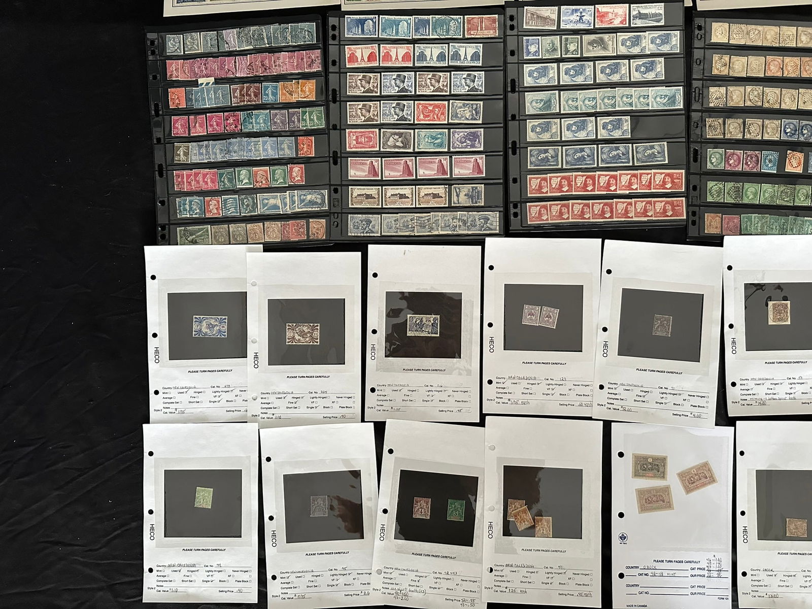 A larger mint and mostly used France accumulation with plenty of better and earlier material throughout. Includes #15/#502 with BOB in identified and priced 103's (some noticeable duplication in places), noticeably better identified and priced items on dealer cards including used #10, #11 (3), #75, #83, #84, #93-#94, #96, #J15, #J18, #J22 plus more, #3/#703 neatly hinged on album pages, better items mostly mint on stock sheets, plus a quality entire dated April 10th, 1849 with a #3 20c black on white paper. Early material generally at least fine, at least f-vf onwards. Very large cat val overall.(Image 1)(Image 2)(Image 3)(Image 4)(Image 5)(Image 6)(Image 7)