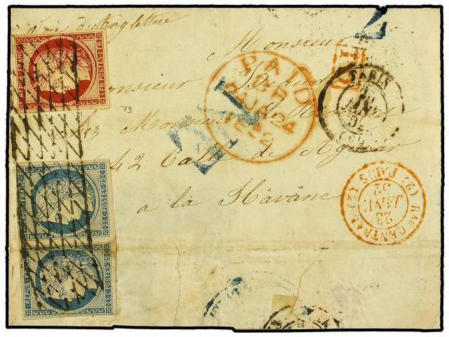 FRANCIA. 1852 (Jan 23). Cover to HAVANA (Cuba), opened for better exhibit display, mailed from PARIS via London (Jan 24), franked by 1849 25c. blue horizontal pair and fine single 1fr. carmine on yellowish tied by GRILLE SANS FIN. Handstruck ´NE´ and rate mark ´2´ in blue of receipt and Havana cds in blue. File fold through pair but a rare first issue cover. Ceres 4,6. (Image1)