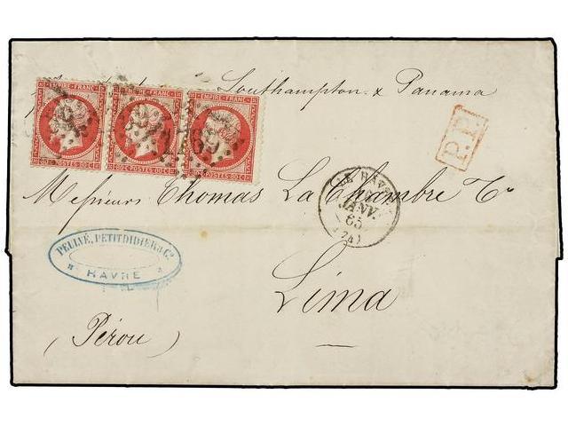 FRANCIA. 1865. LE HAVRE a LIMA. 80 cts. rosa (3) tarifa de 2,40 Fr. doble porte por la vía inglesa. Carta con texto ´Movement Maritime avec les Mers du Sud du 1 au 15 Janvier 1865´, llegada al dorso. MUY INTERESANTE. (Image1)