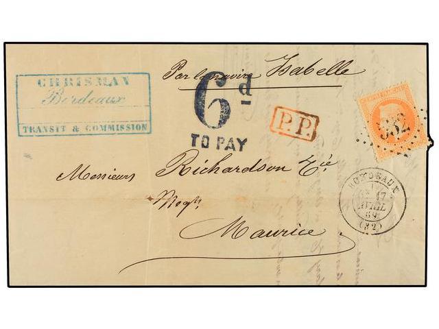 FRANCIA. Yv.31. 1869. BORDEAUX a ISLA MAURICIO. 40 cts. naranja, marca 6d/TO PAY, manuscrito ´Par le naviere Isabelle´. Muy bonita. (Image1)