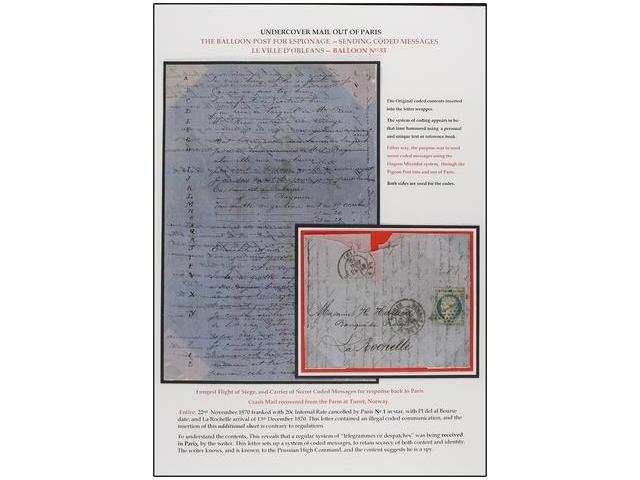 FRANCIA. 1870 (Nov. 22). PARIS to LA ROCHELLE. BALLOON ´VILLE D´ORLEANS´. Entire franked with 20 cts. blue, Star ´1´ cancel and PARIS/PL. DE LA BOURSE cds. Arrival (13 Dic.) on reverse. Very interesting text sending coded messages. CRASH MAIL recovered from the Farm at Tunet (Norway). RARE. (Image1)