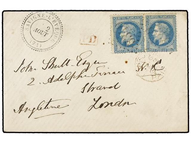 FRANCIA. Yv.20. 1870. SAVIGNE a LONDRES. 20 cts. azul mat. rombo de cifras grandes y fechador de puntas SAVIGNE-L´EVEQUE. MAGNÍFICA. (Image1)