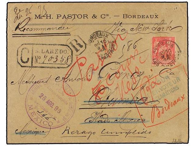 FRANCIA. 1896. BORDEAUX a OTUMBA reexpedida a LAREDO y finalmente devuelta a Francia. Carta certificada franqueada con sello de 50 cts. rosa. F. Sheller. (Image1)