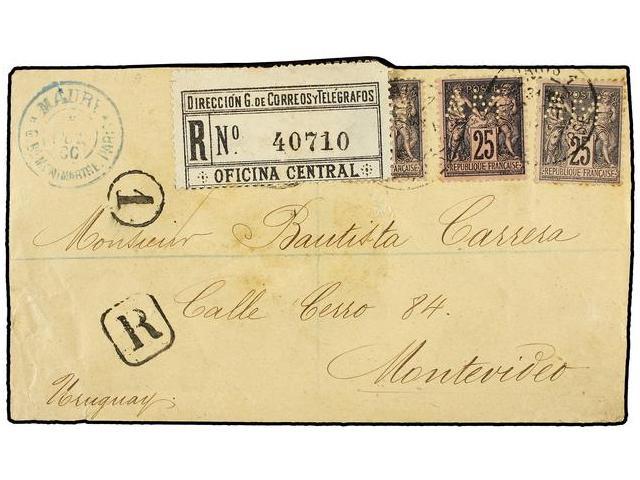 FRANCIA. Yv.97 (3). 1900. PARÍS a MONTEVIDEO (Uruguay). 25 cts. negro (3) con perforación ´AM´. Carta certificada. Al dorso llegada. (Image1)