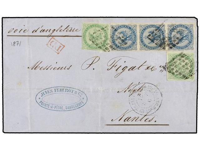 GUADALUPE. 1871. POINTE A PITRE a FRANCIA. 5 cts. verde (2) y 20 cts. azul, tira de tres, mat. ROMBO DE PUNTOS. (Image1)