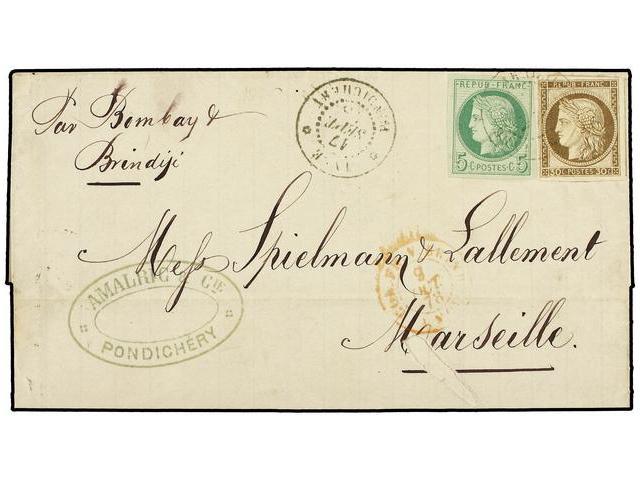 INDIA FRANCESA. Ce.17+20. 1871 (April 12). Entire letter from PONDICHERY to MARSEILLE franked by General Issues 1872-77 Ceres 5c. green on greenish and 30c. brown tied by nead INDE-PONDICHERY cds in black. Red Brindisi Ambulant on front (Oct. 9). Slight tear in address panel but an attractive and scarce usage. (Image1)