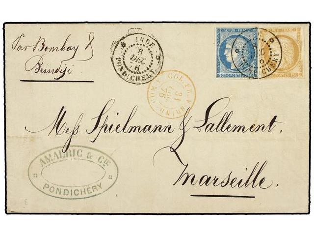 INDIA FRANCESA. Ce.19+23. 1876 (Dec 8). Entire letter to MARSEILLE franked by General Issues Ceres 1872-77 large figures 15c. bistre and 25c. blue tied by neat INDE-PONDICHERY cds with repreated strike at left in black. Circular Brindisi Mondane TPO (Dec 31) also on front of a fresh and fine entire. (Image1)