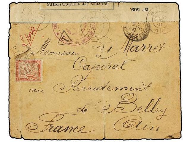 INDOCHINA. 1901 (March 6). Strampless Military cover with CORPS D´EXPEDITION DE CHINE / DIRECTION DU SERVICE DE SANTE Anchor cachet on reverse and CHINE unclear despatch on front, cover slightly battered in transit and Officially Resealed by Posts & Telegraph Office at top. Addressed to a Recruiting Corporal but nevertheless taxed on arrival with Postage Due 30c. rose tied by BELLEY cds (April 22). (Image1)