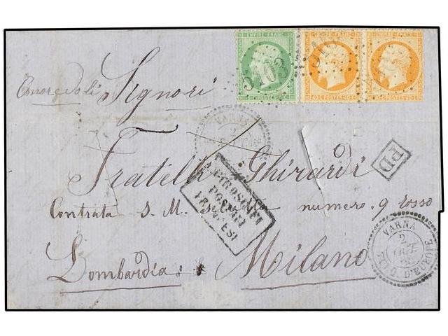 LEVANTE: CORREO FRANCES. 1865. VARNA a MILÁN. 5 cts. verde y 40 cts. naranja (2, un sello, dentado cortado a tijera en origen). Mat. numeral 5103 y fechador VERNA/TUR.D´EUROPE y marca PIROSCAFI/POSTALI/FRANCESI. Cortes de desinfección. MUY BONITA. (Image1)
