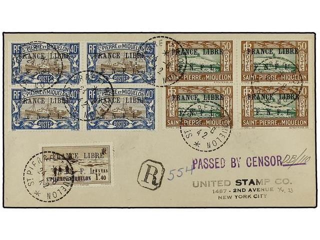 SAN PEDRO Y MIQUELON. Yv.237 (4), 239 (4), 265. 1942. ST. PIERRE ET MIQUELON to NEW YORK. Multicolored franking on registered cover, arrival on back. (Image1)