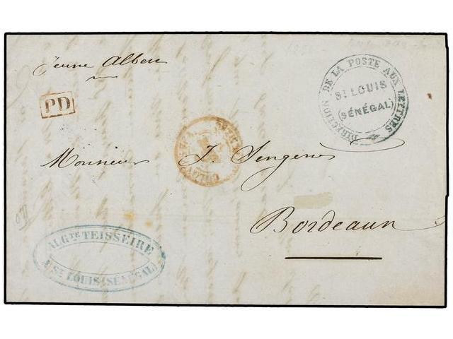 SENEGAL. 1856 (Feb 6). Entire letter from ST. LOUIS to BORDEAUX with Company cachet on front and fine circular DIRECTION DE LA POSTE AUX LETTRES - ST. LOUIS (SÉNÉGAL) handstamp in blue-green. Bordeaux arrival (April 3) cds on reverse and manuscript alongside ´3´. (Image1)