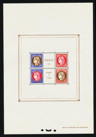 France. Scott 329, VF Hinged only in margins, 1937 PEXIP Sheet CV $360.00 (Image)