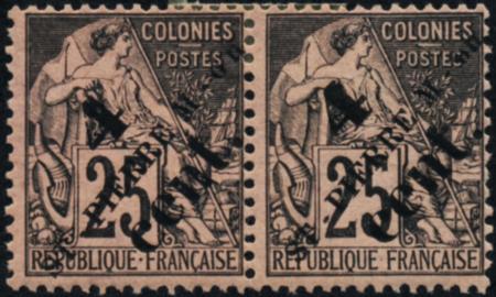 St. Pierre and Miquelon. Scott 43, F-VF LH, pair, 1892 4c on 25c with CENT in surcharge CV $25.00 (Image)