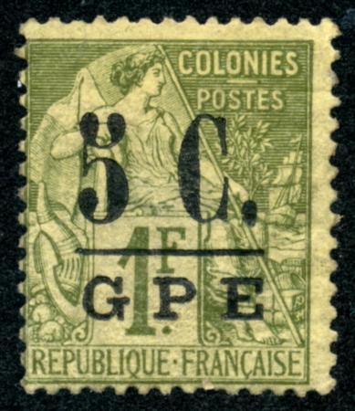 Guadeloupe. Scott 11, Fine HR, 1891 5c on 1fr brnz grn CV $16.00 (Image)