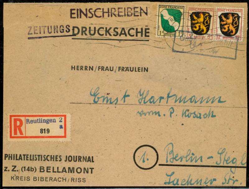 1, 3 and 12 pfennigs in part-cash-postage with black box cancel of 2 lines "taxe precu. Pfennigs" and entry "60" Pennig on complete address label for a heavy registered newspaper printed matter in the weight to 100 g from REUTLINGEN 25.6.46 to Berlin (1,2,6)