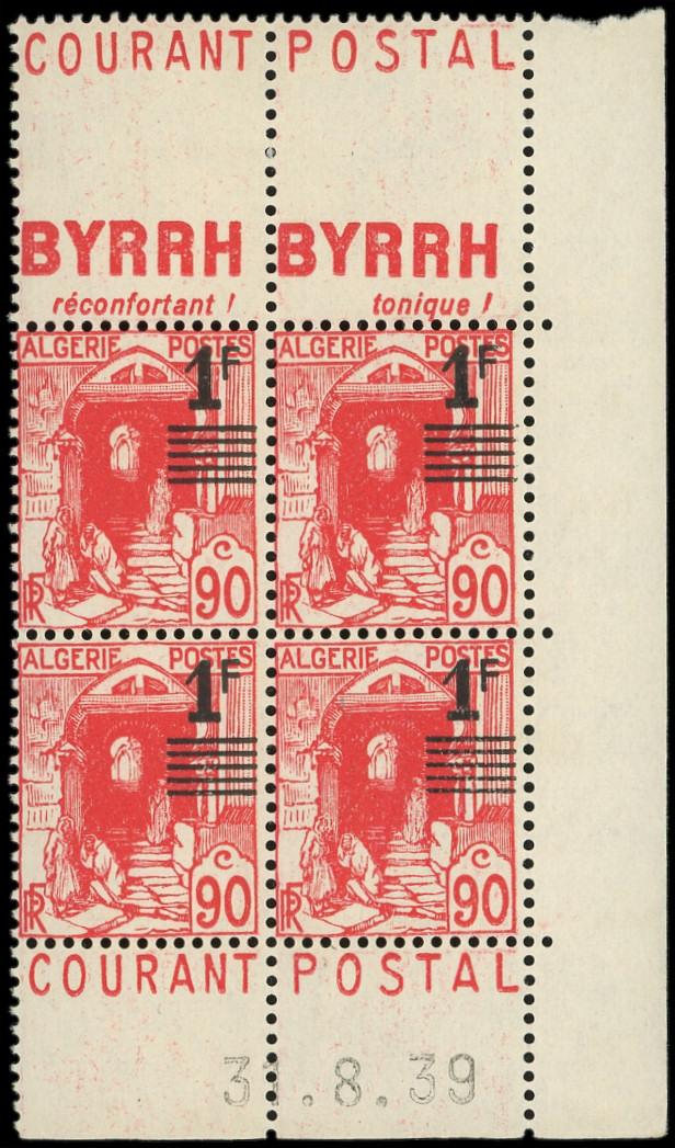 158Ae : 1f. s. 90c. rouge, BLOC de 4 CD 31/8/39 avec pub et surcharge TRES DEPLACEE, TB (Image)