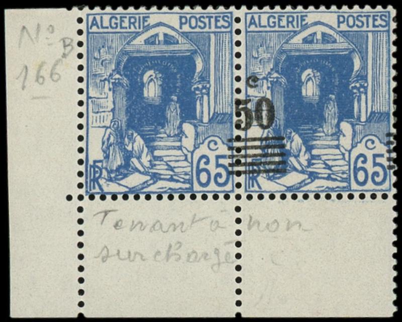 166 : 50c. sur 65c. bleu, PAIRE cdf, surcharge A CHEVAL, 1 ex. presque sans surcharge, TB. Br (Image)