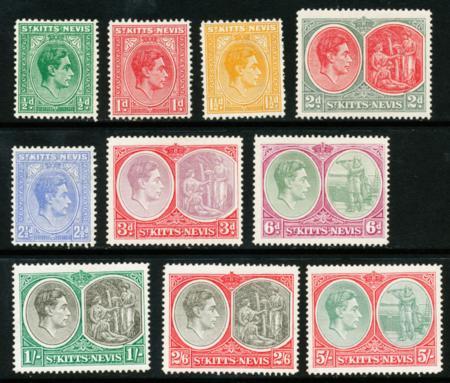 St. Kitts-Nevis. Scott 79-81, 82b, 83, 84c, 85b, 86a-88a, F-VF LH, 1938-49 KGVI, all perf 14, short set 1p-5sh CV $163.95 (Image)
