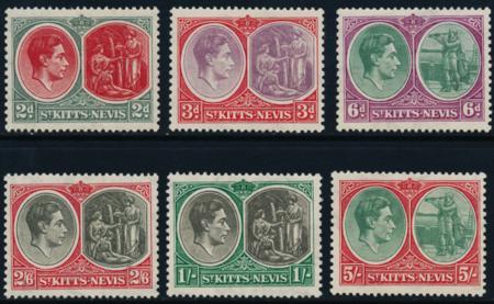 St. Kitts-Nevis. Scott 82-86, 87b, 88, VF VLH, 1938 2p//5sh, perf 13 x 11.5 CV $124.00 (Image)
