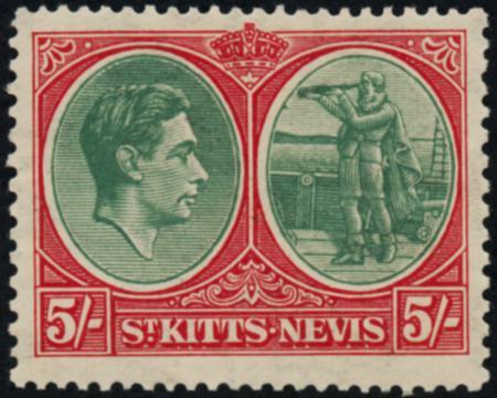 St. Kitts-Nevis. Scott 88, VF LH, 1938 5sh perf 13x11½ CV $50.00 (Image)