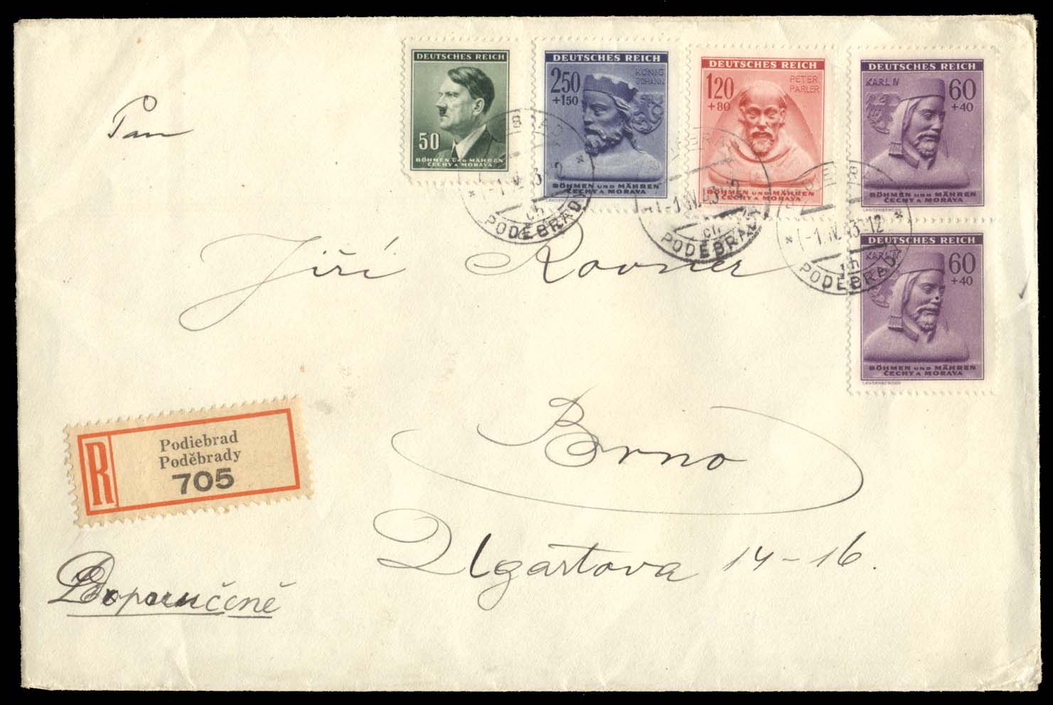 Czechoslovakia-Bohemia & Moravia 65,,B15-17 1943 Cover with (5) stamps and with (3) Cinderellas as flap seals, registered red and black numbered label at lower left. Reverse with (2) dark olive die cut labels depicting Podebrady Castle and a statue of King George of Podebrady. Also, with a red perforated 11/5 label picturing Jaroslav Cermak, reading "1831/1878/Jar. Cermak" and printer inscription reading "1034" 6r1934" at lower left and "RIJACEK" at lower right. Cermak was a fairly famous Czech painter who studied under Peter Paul Rubens style (Image)