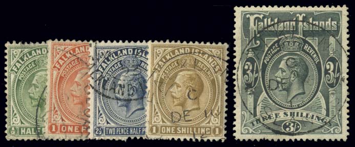 Falkland Islands 30-1, 33, 35-6,½p-3sh (5) Short Set King George V Issues, Wmk 3, VF, postally Used with light ccl, great starter group, 3sh has pulled perf at bottom Cat($169) (Image)