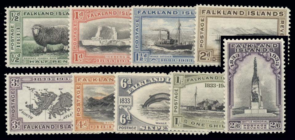 Falkland Islands 65-73,½p-2sh6p Centenary of British Colonization Short Set 9 of 12, F-VF and VF VLH, nice colors, fresh set Cat($500) (Image)