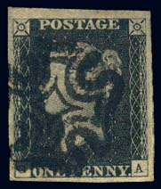 Great Britain 1,1p Black, Plate no. 10, Pos. Q-A, four ample to large margins, Stage 3 "O" flaw of "ONE" with tiny lower left corner crease and impression of black Maltese cross ccl. Very scarce variety! Cat($425) (Image)