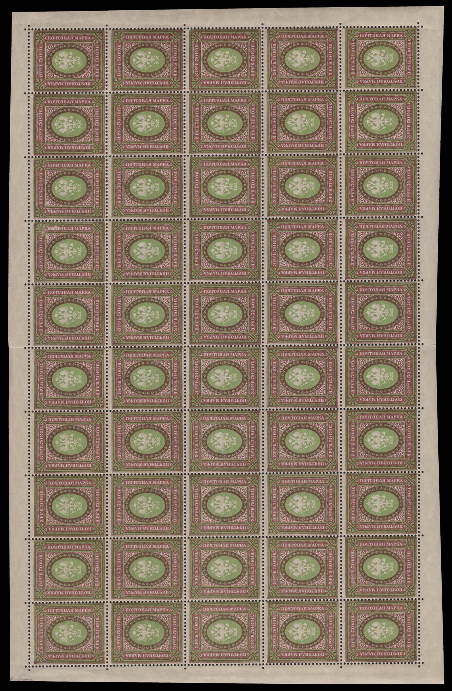 Russia 137b,3.50r Maroon and Light Green, Horizontal Varnish Lozenges on Face, Perf 13½ x 13, Pane of 50, F-VF NH, cv is for (50) singles, scarce as full pane and would be great for a specialist, due to the many minor printing anomalies Cat($275) (Image)