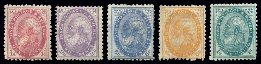Tonga 1, 2a, 3-5,1p-1sh 1886-92 King George I Issues, complete set of 5, Fine-Avg to F-VF OG, except no. 4 small part partial OG, no. 2a small thin top two left perfs Cat($223) (Image)