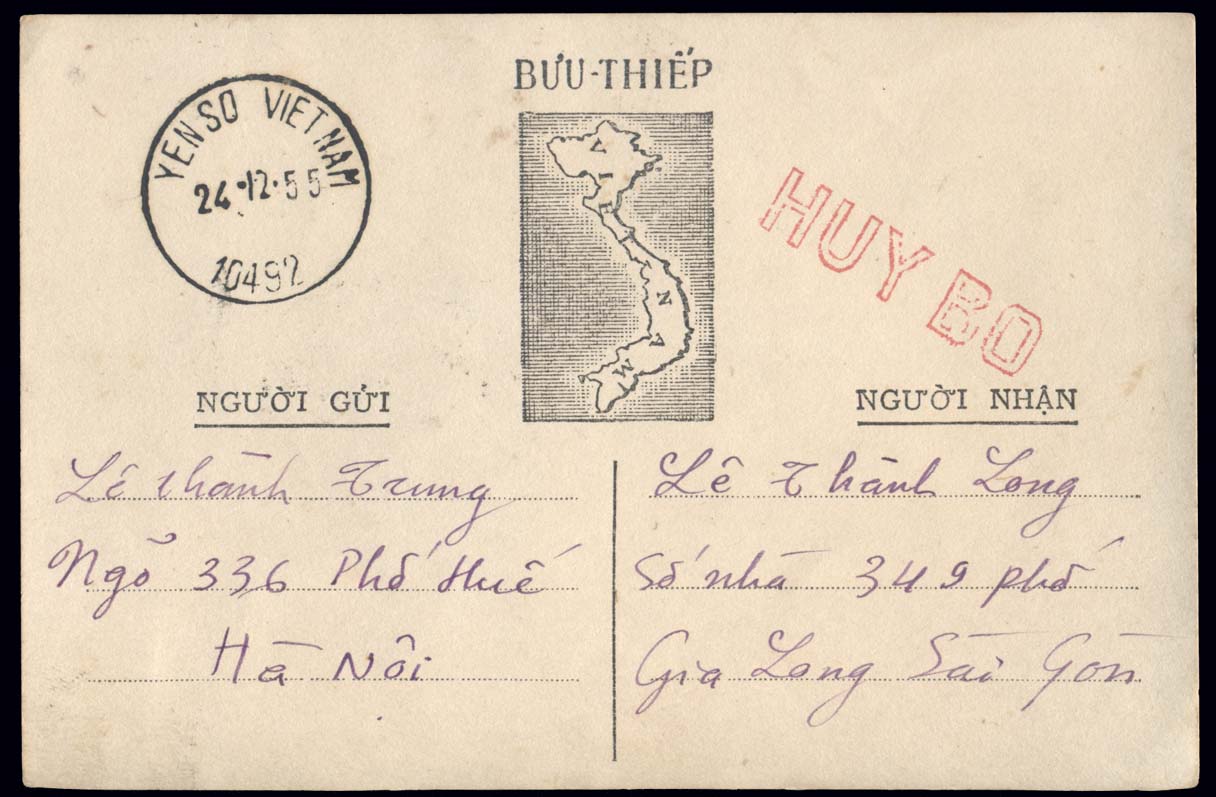 Vietnam 1955,Postal Card, VF, postally used with postmark cds "YENSO VIETNAM/24-12-55/10492" posted to Siagon, early Inter-regional correspondence, scarce (Image)