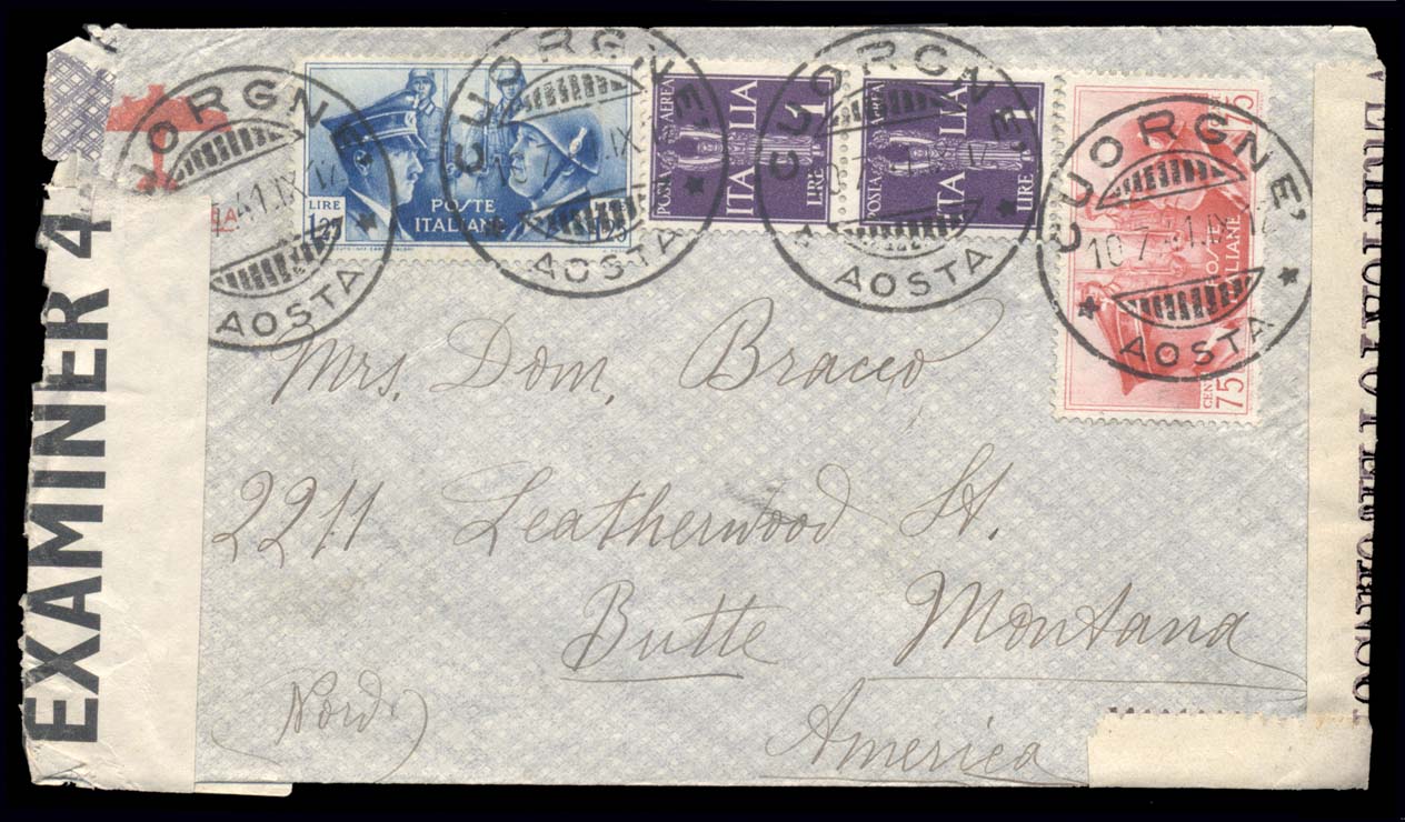 Italy 417-18, C16,75c and 1.25l Rome-Berlin Axis Issues and (2) 1R Airpost on commercial censored cover, stamps F-VF with multiple dc bridge postmarks "CUORGNE/10-7-41. 1x12/AOSTA", with (2) censor examiner seals (Italian on right and U.S. on left) addressed to Butte, Montana (we suspect RARE usage). Cover is Airmail envelope roughly opened at left and couple small stains on back (Image)